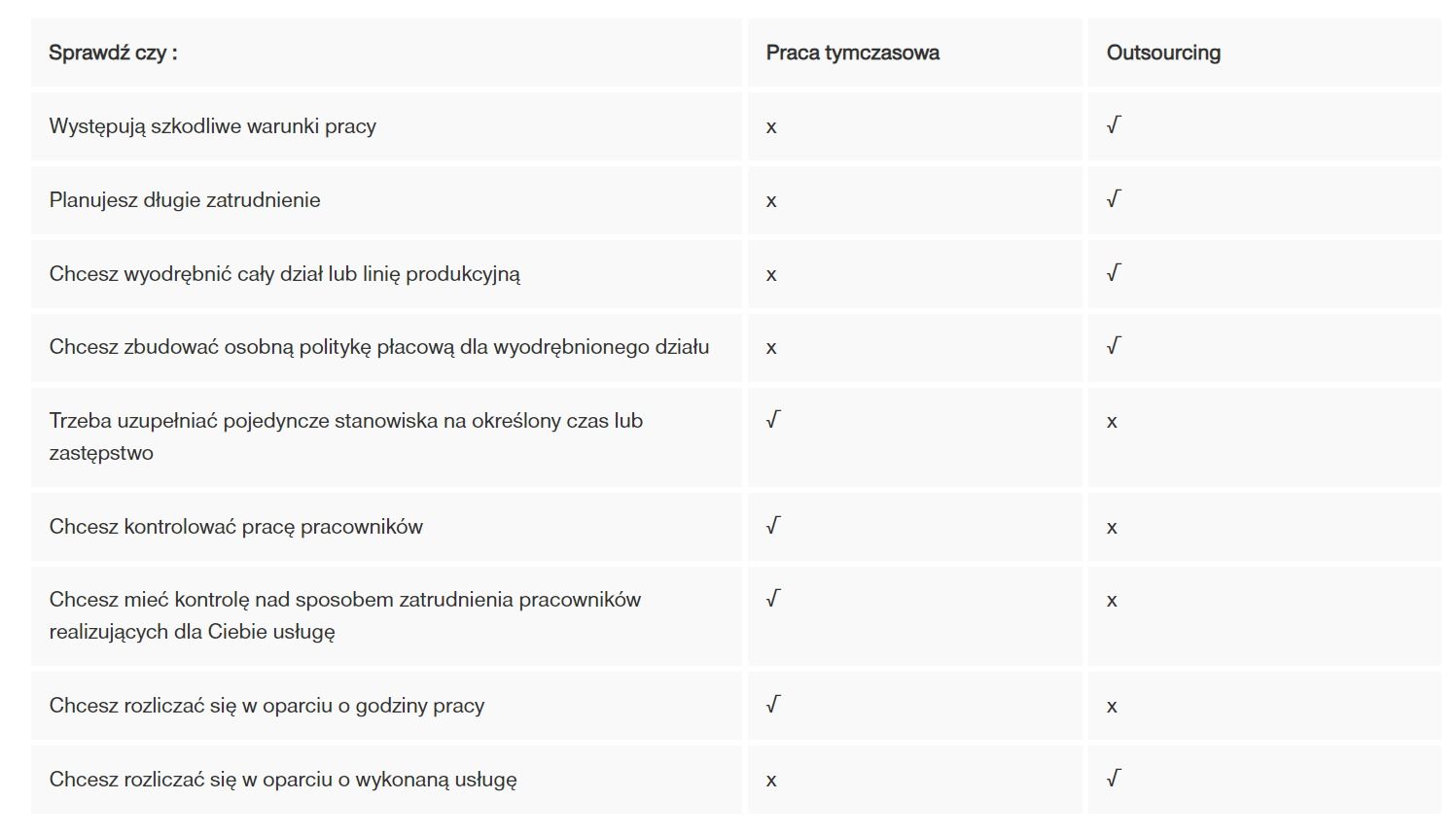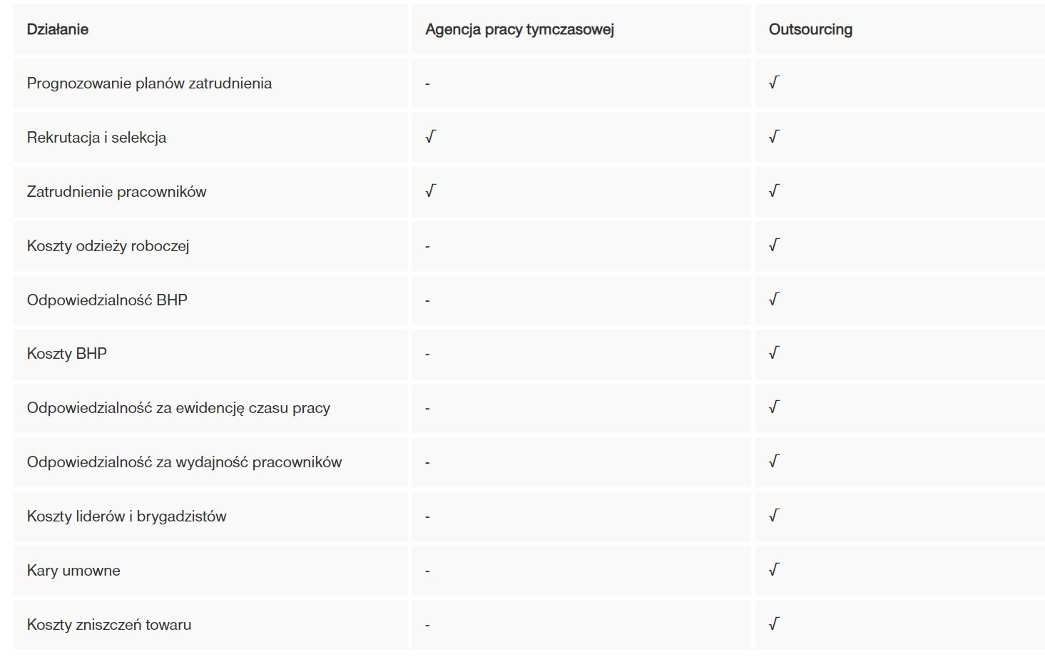 Głównym elementem, który różnicuje to, czy firma powinna skorzystać z outsourcingu, czy z pracy tymczasowej jest również zakres odpowiedzialności związany z zatrudnieniem i kontrolą, jaką chce przekazać agencji (lub utrzymać). Obrazuje to poniższa tabela: